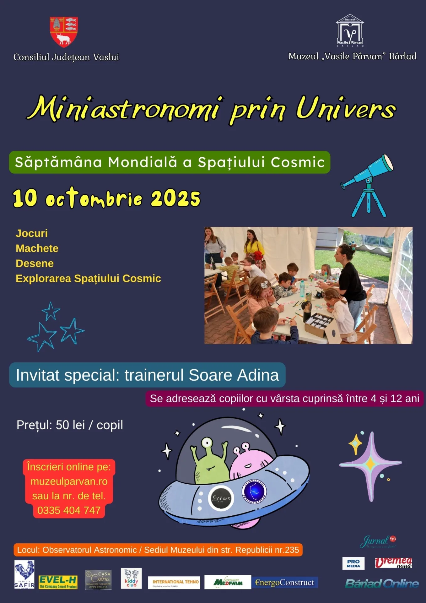 Cu prilejul Săptămânii Mondiale a Spațiului Cosmic, Observatorul Astronomic din cadrul Muzeului „Vasile Pârvan” din Bârlad va organiza vineri, 10 octombrie 2025, o activitate interactivă dedicată copiilor cu vârsta cuprinsă între 4 și 12 ani.