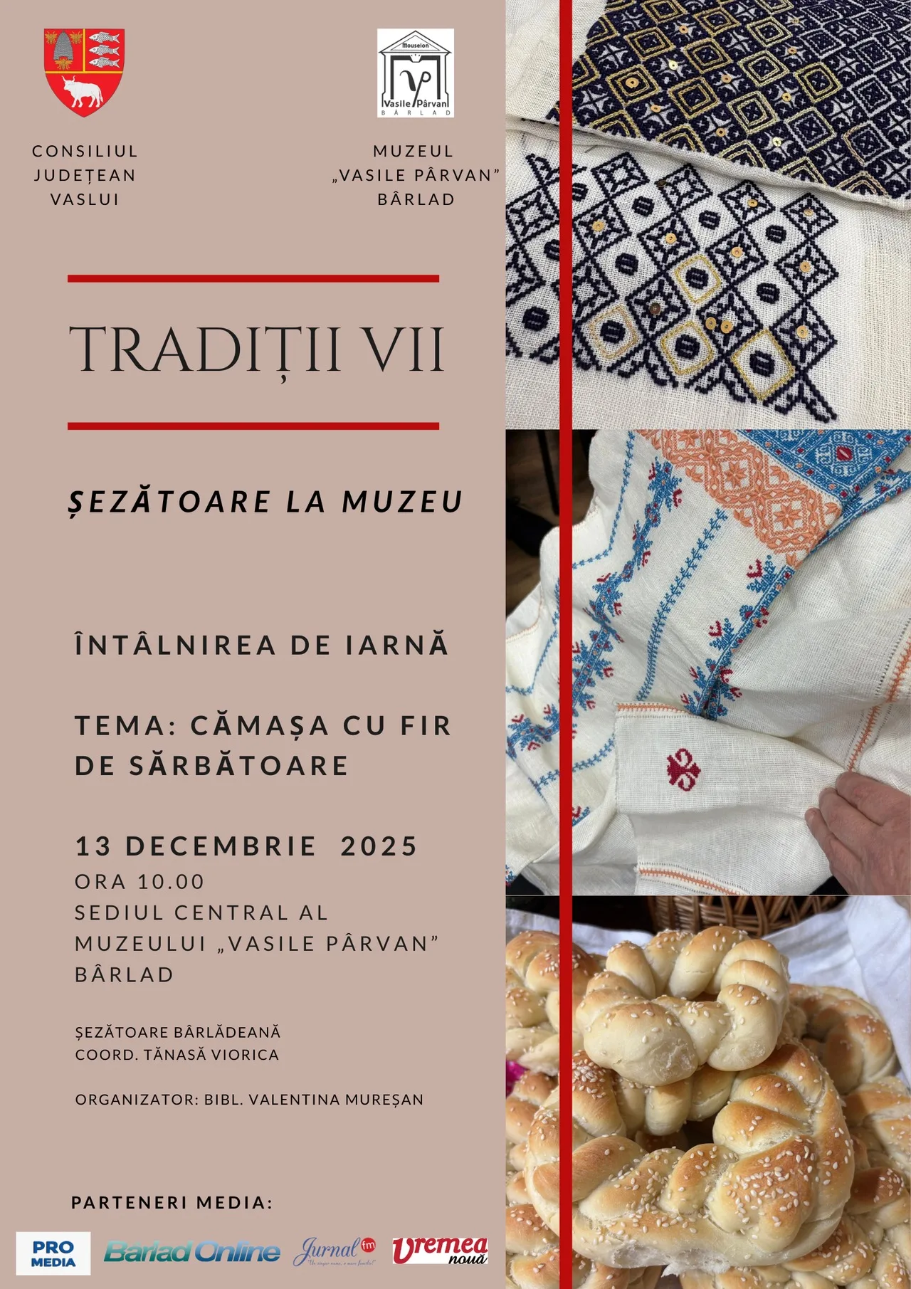 Împreună cu membrele grupului Șezătoare bârlădeană, coordonat de doamna Viorica Tănase, vă invităm cu drag la întâlnirea de iarnă, ce va avea loc sâmbătă, 13 decembrie 2025, ora 10.00, la sediul central al muzeului.