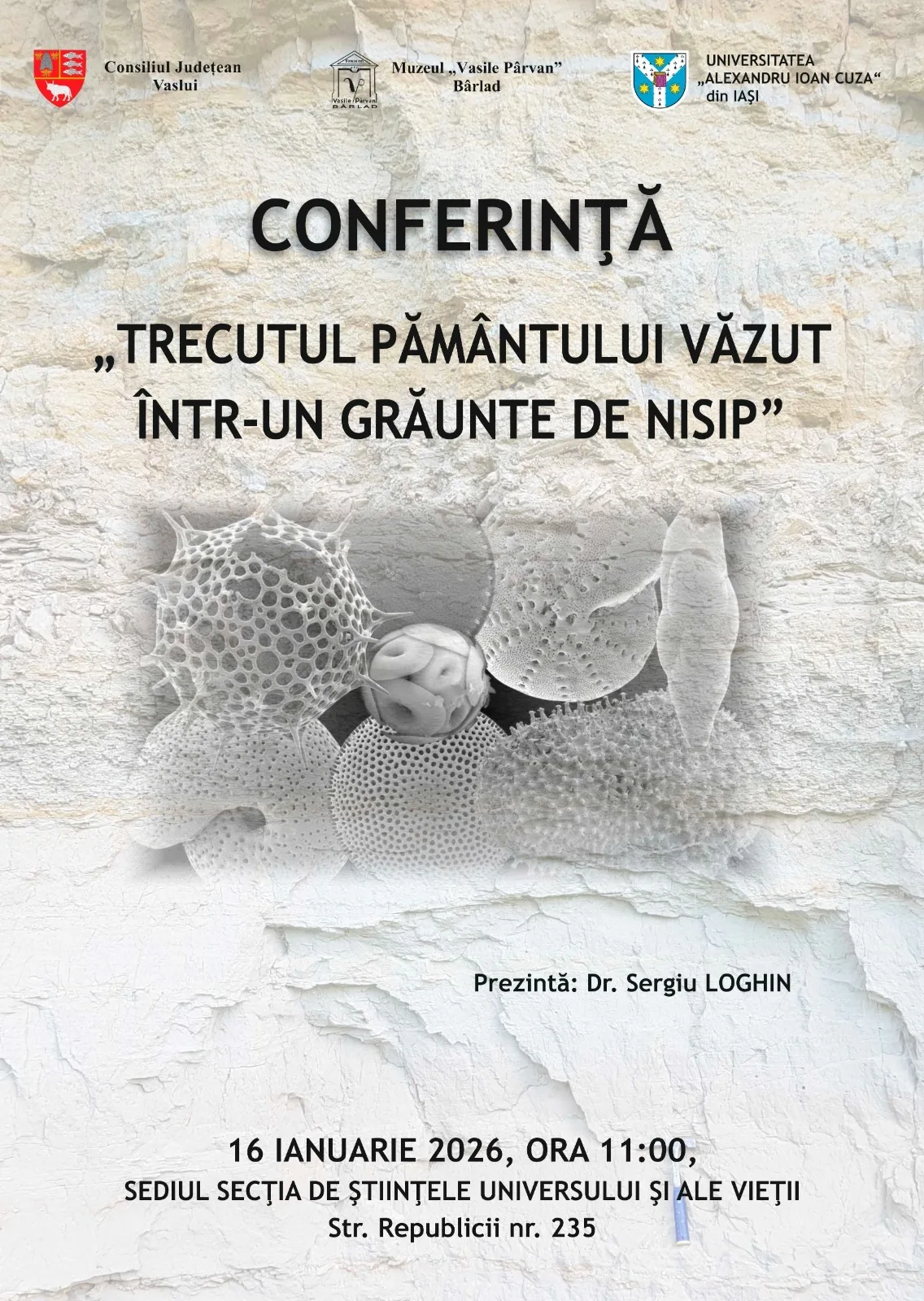 Consiliul Judeţean Vaslui și Muzeul „Vasile Pârvan”, Bârlad vă invită Vineri, 16 ianuarie 2026, ora 11:00, la conferința „TRECUTUL PĂMÂNTULUI VĂZUT ÎNTR-UN GRĂUNTE DE NISIP”, susținută de dr. Sergiu LOGHIN, șef lucrări în cadrul Departamentului de Geologie, Facultatea de Geografie și Geologie, Universitatea „Alexandru Ioan Cuza” din Iași și cercetător științific la Institutul Național de Cercetare-Dezvoltare pentru Geologie și Geoecologie Marină.