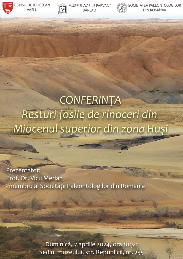Conferința „Resturi fosile de rinoceri din Miocenul superior din zona Huși” 7 aprilie 2024