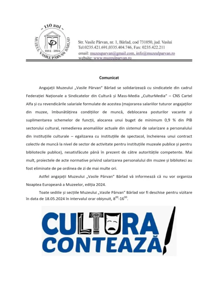 Anunț grevă – Noaptea Muzeelor 2024